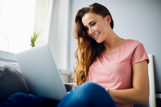 Portrait of a happy beautiful young woman smiling and using laptop while sitting on sofa in living room